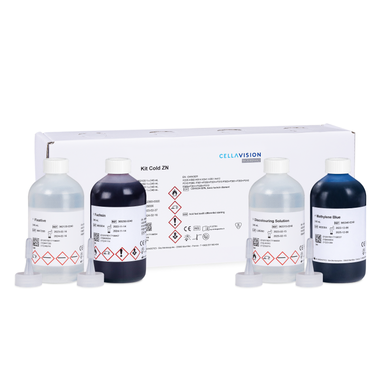 Kit Cold ZN Staining allows a detection of mycobacteria or Acid Fast Bacilli (AFB). The characteristic structure of the mycobacteria walls hampers discolouring agent penetration. This property allows AFB to keep Fuchsin staining after discolouring with acid and alcohol.